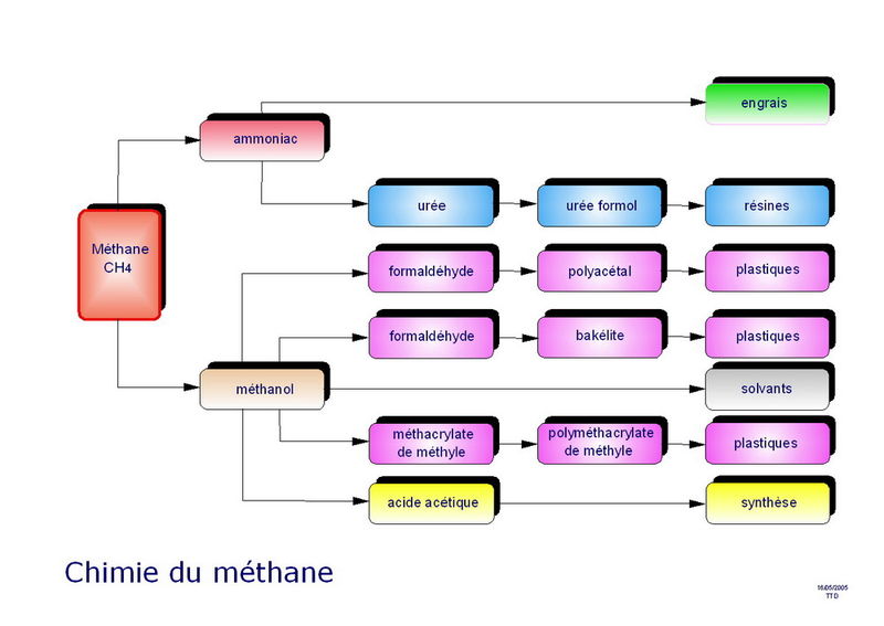 C'est aussi à partir du méthane qu'on synthétise l'ammoniac (NH3) et l'urée (CO (NH2) 2), qui sont le point de départ de l'industrie des engrais.