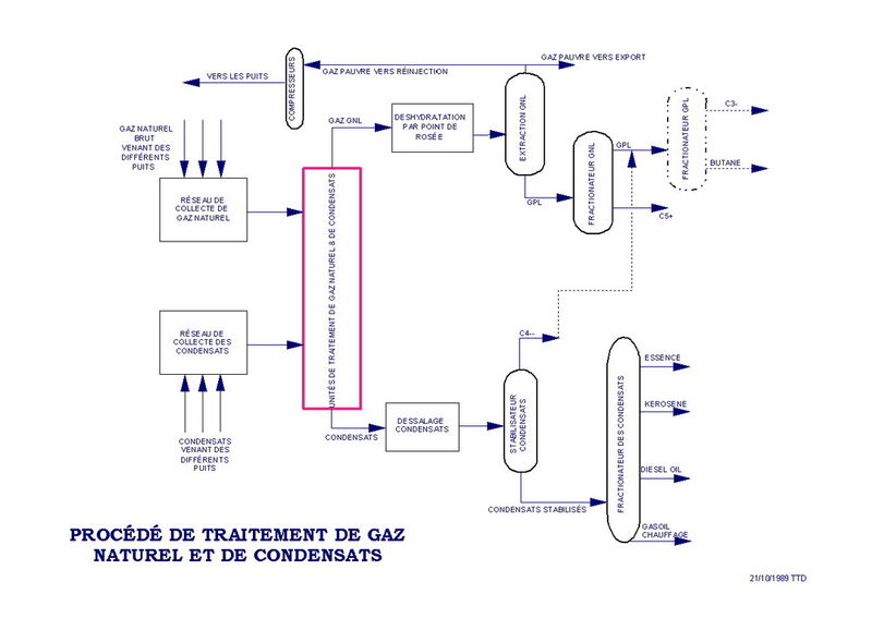 Pour le traitement, et si on veut séparer les GPL avant le transport, à partir des gisements de gaz et de condensats (si ceux-ci sont proches), on installe deux réseaux de collecte, un pour le gaz naturel et un autre pour les condensats. Le gaz et les condensats sont dirigés vers des installations de traitement et de désulfurisation.